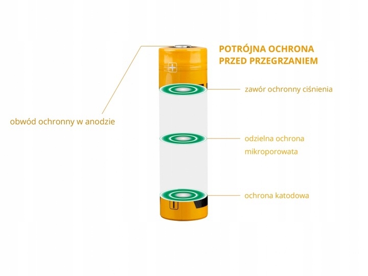 Producent zastosował wielopoziomowy system zabezpieczeń, który w maksymalnym stopniu wydłuża żywotność i zapewnia najwyższy poziom bezpieczeństwa akumulatora.