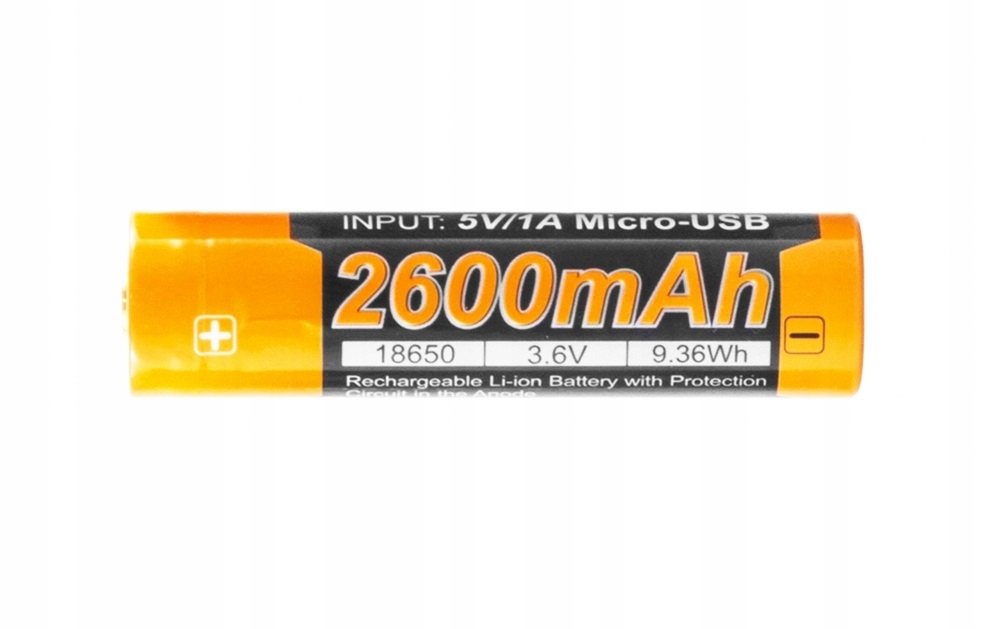 Akumulator ARB-L18-2600U to wysokiej jakości akumulator litowo-jonowy 18650 o pojemności 2600 mAh, przeznaczony do latarek myśliwskich i taktycznych oraz urządzeń o dużym poborze prądu. Posiada wejście Micro USB umożliwiające ładowanie bezpośrednio z innego urządzenia, nie ma potrzeby zabierania ładowarki. Można je również ładować tradycyjną ładowarką. Rekomendowane ładowarki to: ARE-C1, ARE-C1+, ARE-C2, ARE-C2+, ARE-X1, ARE-X1+, ARE-X2