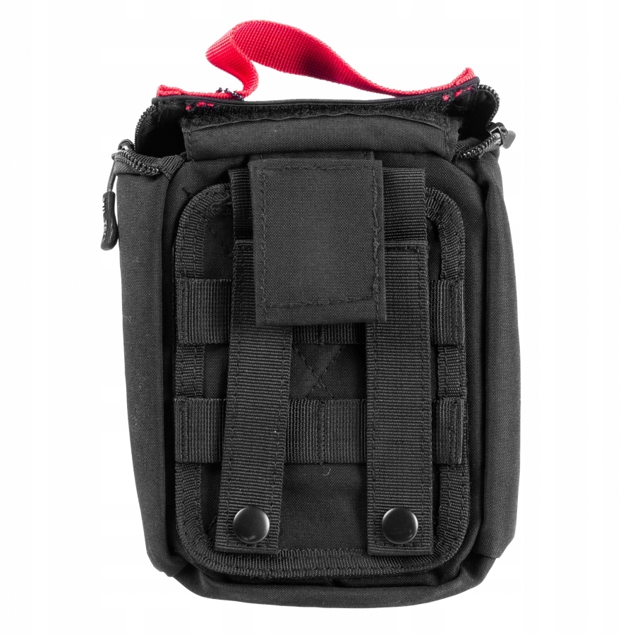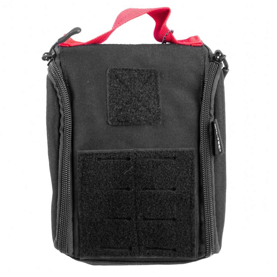 Na przodzie kieszeni znajduję się panel velcro z laserowo wycinanymi otworami MOLLE, umożliwiający mocowanie dodatkowej kieszeni oraz emblematów podszytych rzepem. Dzięki modułowej konstrukcji apteczka zrywana ma możliwość szybkiego odpięcia z kamizelki, plecaka lub panelu.