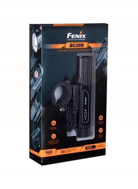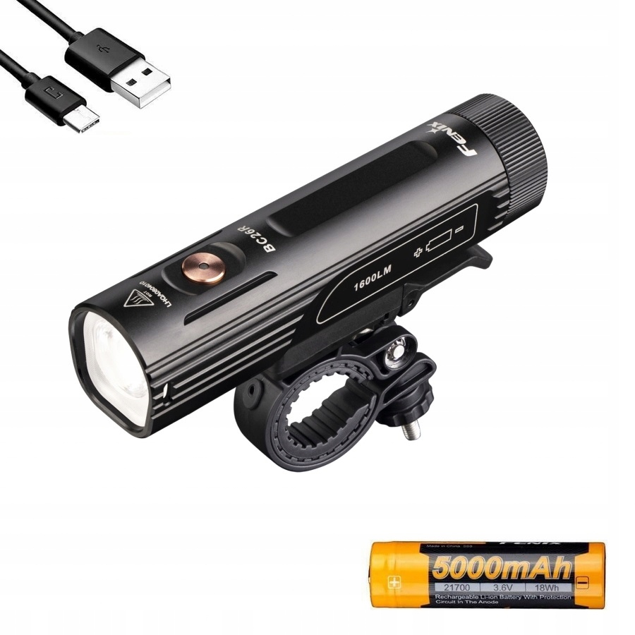 Fenix BC26R to latarka rowerowa o szerokim strumieniu 1600 lumenów, wyposażona w pojemny akumulator ARB-L21 5000 mAh, port szybkiego ładowania USB-C, pojedynczy przycisk ułatwiający sterowanie podczas jazdy oraz mechanizm szybkiego wypięcia z kierownicy.