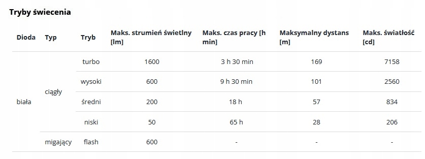 | Liczba trybów świecenia | 5 |