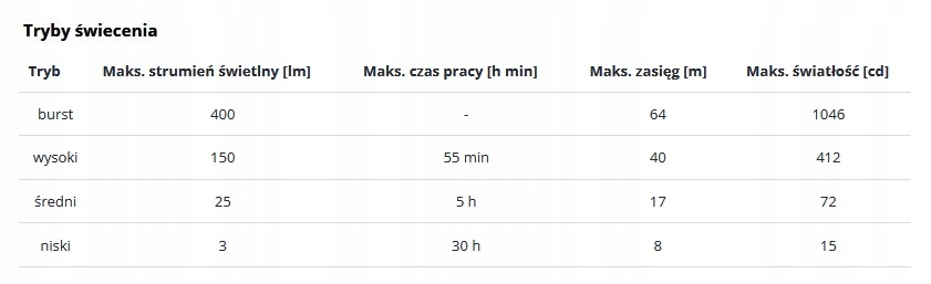 Użytkownik ma do dyspozycji 4 tryby światła: niski, średni, wysoki oraz burst 400 lumenów. W trybie wysokim 150 lumenów latarka może pracować do 55 minut, w trybie niskim 3 lumenów nawet do 30 godzin.