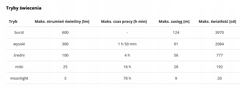 Użytkownik ma do dyspozycji 5 trybów światła: moonlight, niski, średni, wysoki oraz burst 600 lumenów. W trybie wysokim 300 lumenów latarka może pracować do 90 minut, w trybie „księżycowym” 3 lumenów nawet do 70 godzin.