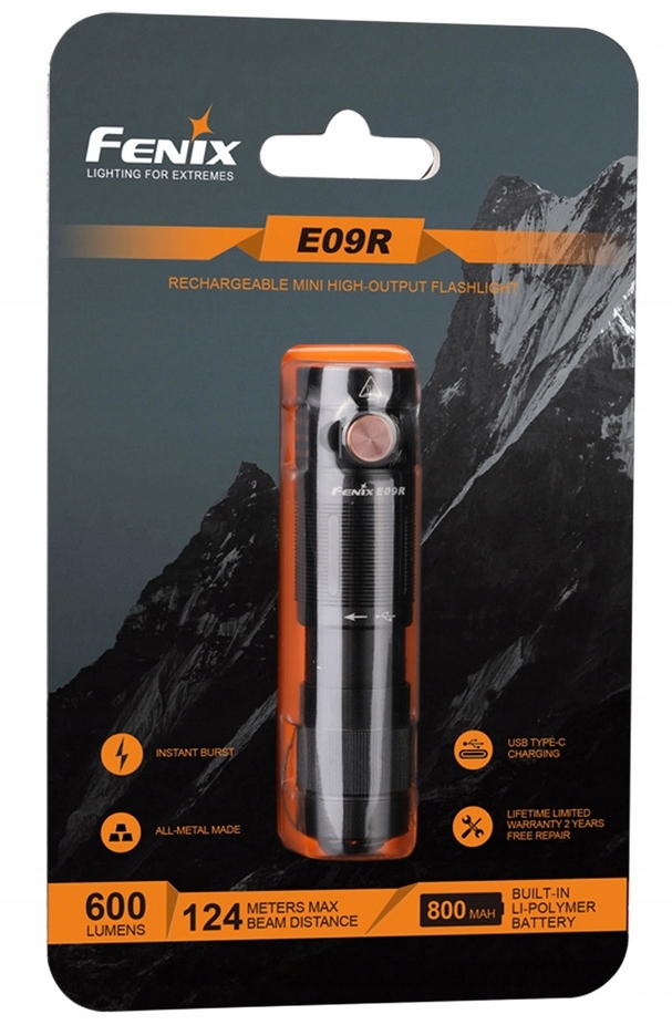 Fenix E09R to kieszonkowa latarka EDC w formie breloka, która emituje światło o strumieniu 600 lumenów, ma 5 przydatnych trybów świecenia, zasięg do 124 m oraz wbudowany akumulator ładowany przez port USB-C.