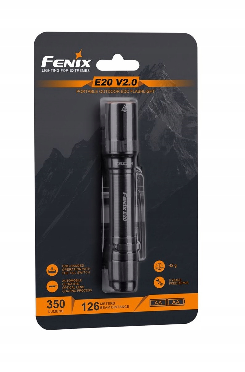 Model Fenix E20 V2.0 jest mniejszy i o połowę lżejszy od poprzednika, zapewnia dłuższy czas pracy i mocniejszy strumie światła – 350 lumenów, dodatkowo posiada praktyczny klips, który ułatwia przenoszenie latarki.