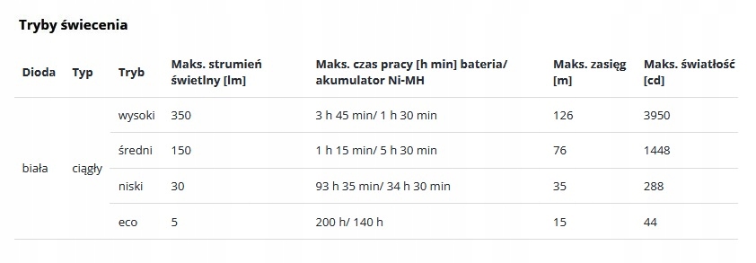 - maksymalny czas świecenia [h min] – 200 h