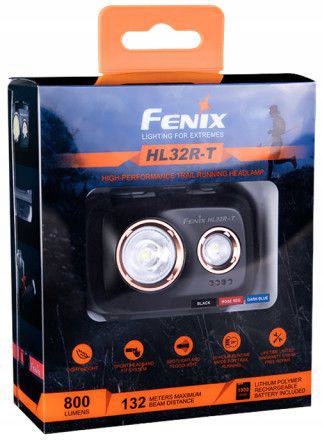 Fenix HL32R-T to lekka czołówka turystyczna o maksymalnym strumieniu 800 lumenów, wyposażona w port ładowania USB-C, podwójny włącznik, regulowaną opaskę Sport Fit System obsługiwaną jedną ręką. Czołówka może być zasilana za pomocą dołączonego akumulatora ARB-LP1900 lub 3 baterii AAA.
