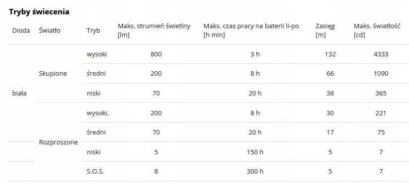 Powyższe parametry mogą różnić się między latarkami, a otoczeniem.