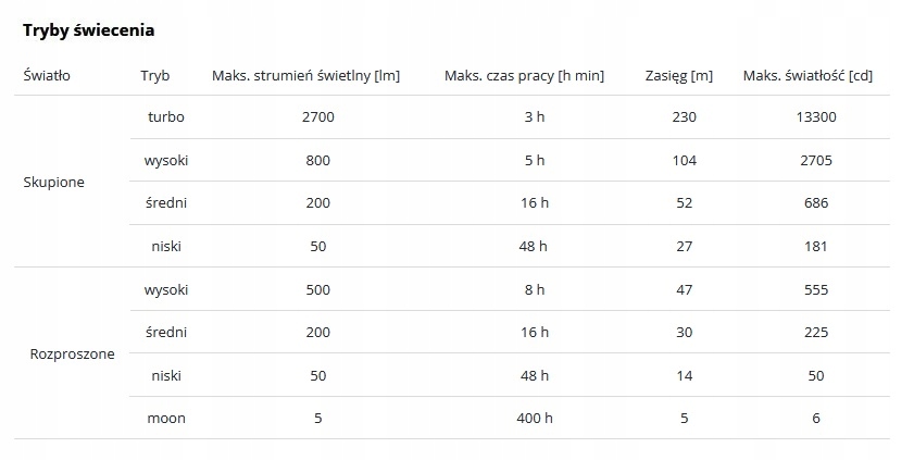 Realne parametry produktu mogą ulec zmianie w zależności od środowiska pracy latarki oraz wykorzystywanego akumulatora.