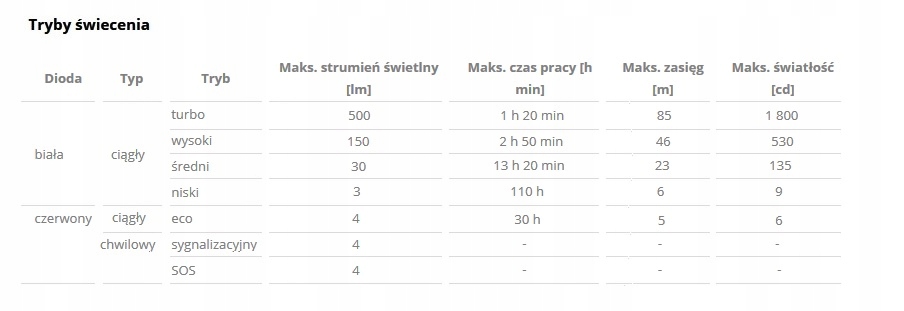 - maksymalny czas świecenia [h min] – 110 h