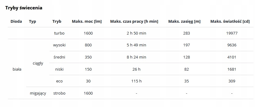 Warto podkreślić, że sumaryczny czas pracy latarki w trybie turbo 1600 lumenów wynosi blisko 3 godziny. Stanowi to wynik zastosowania nowoczesnej diody o stosunkowo niskim poborze prądu oraz bardzo wydajnego akumulatora.
