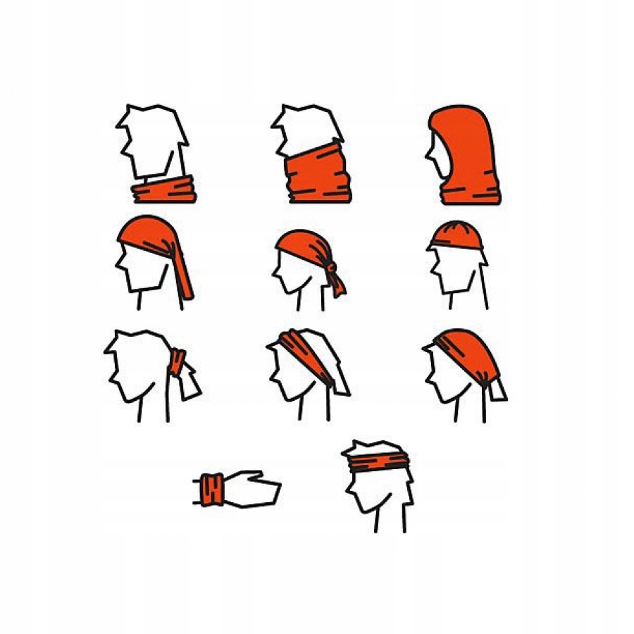 Chusta ma formę bezszwowego komina, który możemy nosić na wiele różnych sposobów m.in. jako szal, czapka, kaptur, maska twarzowa, opaska na głowę, bandana.