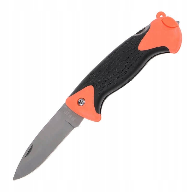 - nóż z głownią ze stali 440, wyposażony w zbijak do szyb, kółko do kluczy i wygodną gumowaną rękojeść,