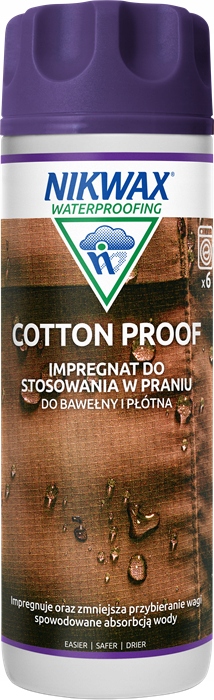 Nikwax Cotton Proof został specjalnie zaprojektowany i zoptymalizowany dla bawełny, mieszanek bawełna-poliester i brezentu: zapewnia trwałą hydrofobowość (DWR), zachowując przy tym właściwości oddychające. Nikwax Cotton Proof nie wymaga ciepła do wytworzenia DWR, dlatego dla uzyskania najlepszych efektów nie jest potrzebne suszenie w suszarce automatycznej.