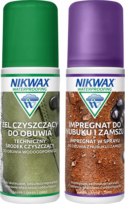 Wysoce skuteczny żel do czyszczenia obuwia z aplikatorem gąbkowym do każdego rodzaju oddychającego obuwia sportowego, turystycznego i typu outdoor oraz impregnat o bezbarwnym kolorze z wygodnym aplikatorem w spray-u do wszystkich rodzajów obuwia wykonanych z szorstkiej skóry.