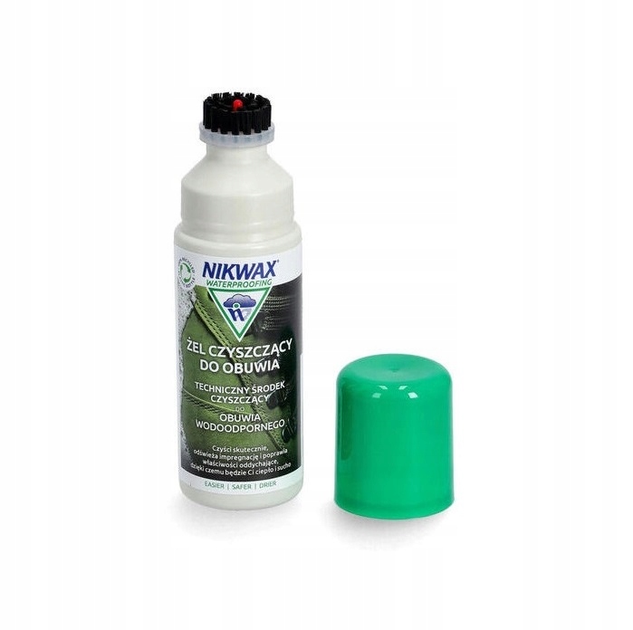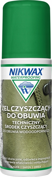 Żel Czyszczący do Obuwia Nikwax można bezpiecznie stosować do oddychającego obuwia wodoodpornego. Nie zostawia on osadu przyciągającego wodę (hydrofilowego), powodującego, że tkaniny i skóra wchłaniają wodę i przemakają. Żel Czyszczący do Obuwia Nikwax usuwa pochłaniający wodę brud i plamy powstałe w czasie użytkowania; to odnowi trwałą warstwę hydrofobową (DWR), powodując, że woda znów będzie się skraplać na zewnętrznej powierzchni.