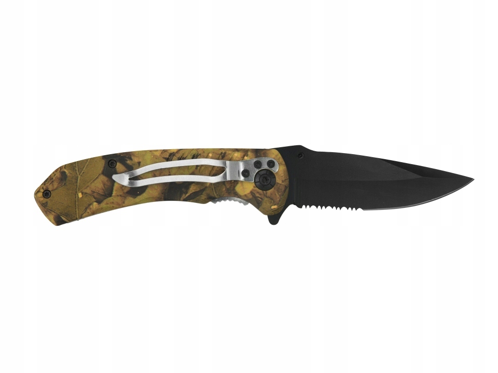 Model JKR430 to nóż EDC średniej wielkości ze wspomaganiem rozkładania głowni. Rękojeść wykonana jest z wytrzymałego metalu o ciekawym wzornictwie z gumowanymi okładzinami w kolorze leśnego kamuflażu (Camo Forest).