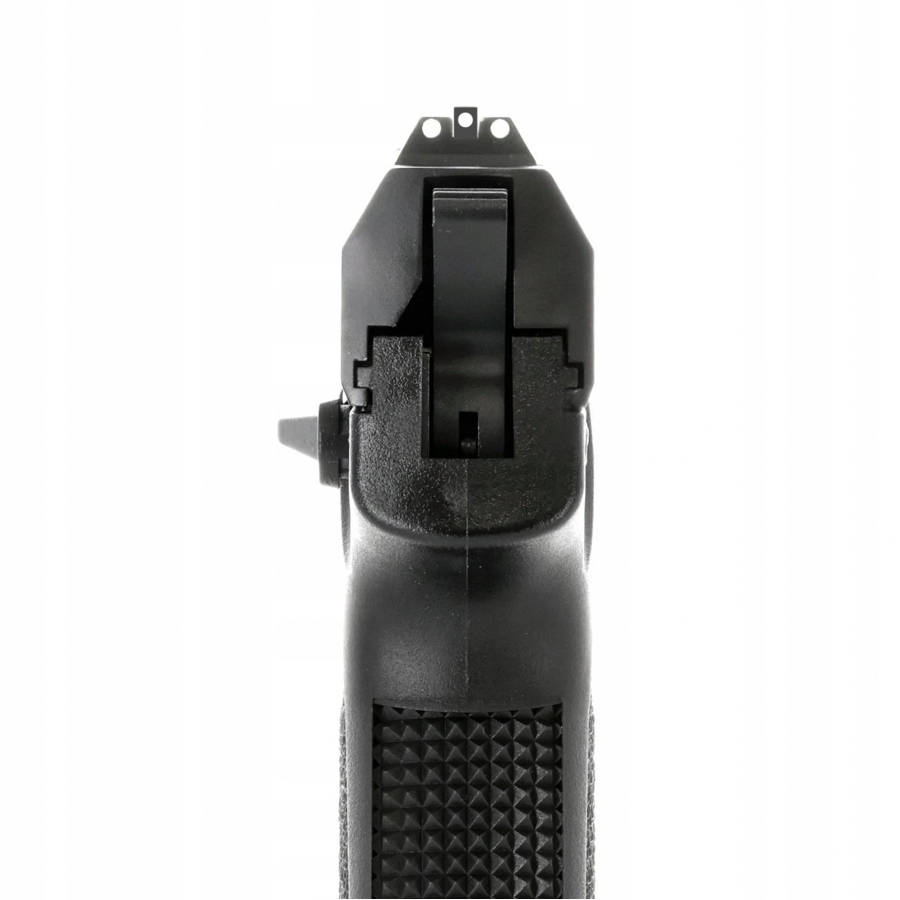 Podobnie jak w oryginale pistolet ma powiększony kabłąk, mechaniczne przyrządy celownicze z białymi oznaczeniami, szkielet z szyną akcesoryjną oraz wygodny chwyt.