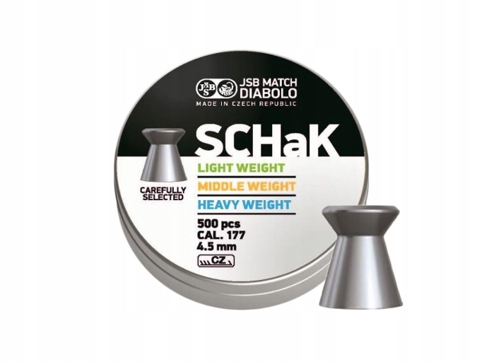 Diabolo SCHaK Heavy Weight (0,535 g) to najcięższy model śrutu z serii Match czeskiej, renomowanej firmy JSB, z płaskim czołem w kalibrze 4.5 mm. Gładki kielich, bez moletowania.