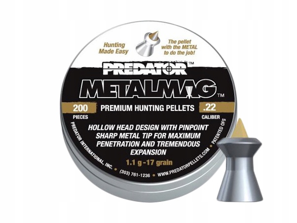 Predator Metalmag to wysokiej jakości, precyzyjny śrut Premium Hunting Pellets, czeskiej firmy JSB. Wyprodukowany we współpracy z amerykańskim partnerem. Charakteryzuje się innowacyjną budową. Łączy ona ostry czubek typu Pointed (szpic) wykonany z metalu oraz ołowiany płaszcz typu Hollow (wklęsły) w jedną śrucinę.