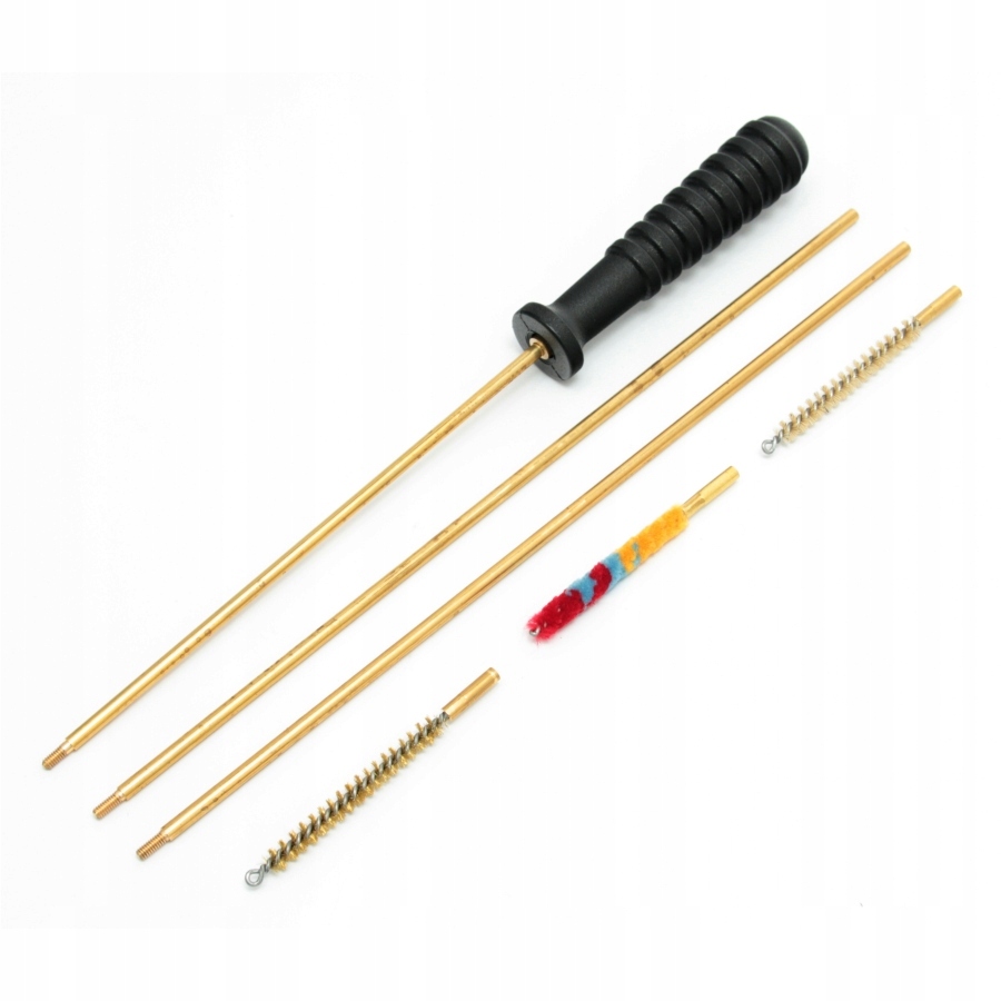 W skład zestawu do czyszczenia broni wchodzi rozkładany wycior, trzy rodzaje szczotek (mosiężna, bawełniana i z włosia).